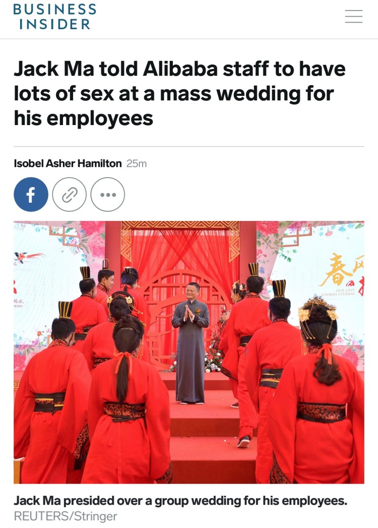 Just read about Jack Ma’s pun at Ali Day. Apparently he holds a wedding for all his employees married in the past year. This made news apparently because he punned a Chinese work schedule know as the 996 (9am-9pm on 6 days of each week) he turned it into 669, which he, being one of very few masters of marketing on earth, then explains are frequency (6 days a week) and intensity (once a day(6/6=1and for a long time! 9 is a Chinese homonym with 久, stipulating the per incident duration is to be long.)